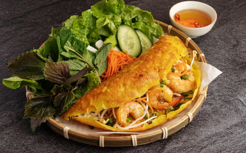 Bánh xèo có lớp vỏ vàng giòn, nhân tôm, thịt, giá đỗ đầy đặn, ăn kèm rau sống và nước mắm chua ngọt. Vỏ bánh mềm mà vẫn giòn, hương vị béo ngậy từ nước cốt dừa rất đặc trưng. Đây là món ăn phổ biến và được yêu thích ở Sài Gòn, đặc biệt là vào buổi chiều. Bánh xèo thường được cuốn trong lá rau và chấm nước mắm pha cay nhẹ.