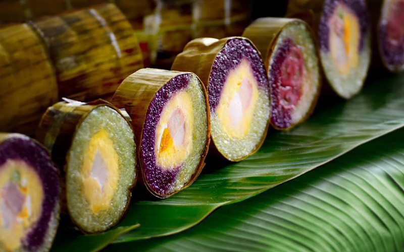 Bánh tét lá cẩm là món bánh truyền thống miền Tây, nổi bật với màu tím đặc trưng của lá cẩm tự nhiên. Bánh có nhân đậu xanh và thịt mỡ, thơm ngon, dẻo mềm. Món bánh thường được làm trong các dịp lễ Tết hoặc ngày hội, mang ý nghĩa sum vầy và may mắn. Bánh tét lá cẩm không chỉ ngon mà còn bắt mắt với sắc màu độc đáo.